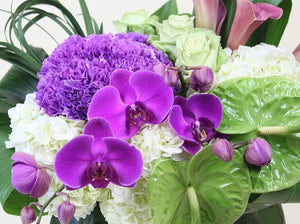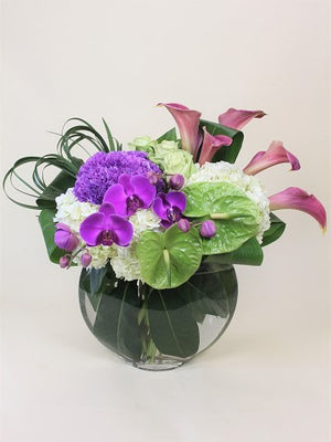 For a more modern and artistic presentation, we suggest our Beatrice arrangement. This collection of year-round blooms features calla lilies, hydrangea, orchids, anthuriums and a tight cluster of fragrant carnations, surrounded by premium greenery, all inside a flattened fish bowl glass vase. This piece really makes a large visual statement for very important celebrations and occasions.
