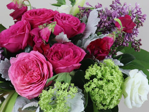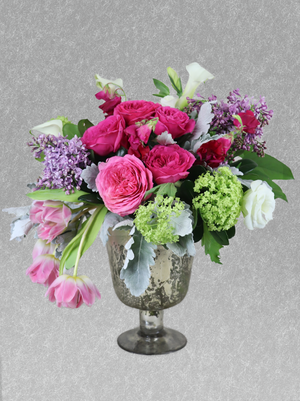 This version of a classic and artistic arrangement includes fresh garden roses, cascading tulips, and calla lilies. We’ve combined these blooms alongside delicate and seasonal flowers in a mercury glass vase to create the perfect symphony of sophistication.
