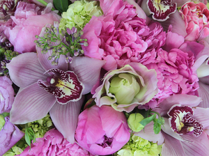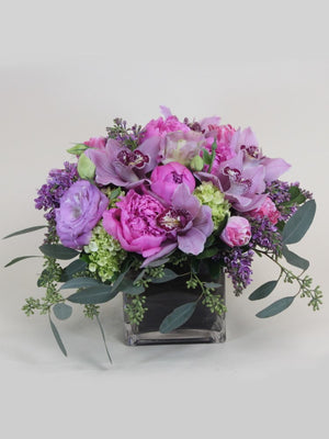 This arrangement is everything Mom could ask for and more. We've gathered together beautiful peonies, cymbidium orchids, baby green hydrangea, lisianthus, tulips and seasonally blooming lilac in a clear glass vase with coordinating greenery to create a soft pink arrangement that Mom will truly love.
