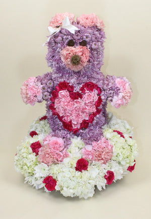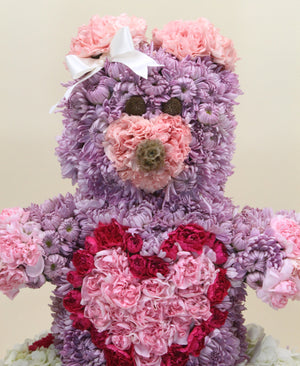 For the new parents who already have everything - this perfect Teddy Bear is made completely of various floral elements to create an amazing presentation that people will be talking about for years to come! This floral sculpture is available in a variety of colors (with proper advance notice) to suit the occasion. Designed using a single prominent color, our cute Teddy is sitting on a pillow of fluffy white hydrangea, and accented all over with coordinating colors and textures. Overall height for Standard is approximately 12+ inches. Overall height for Premium is approximately 15+ inches. Balloon add-ons available in the drop down box