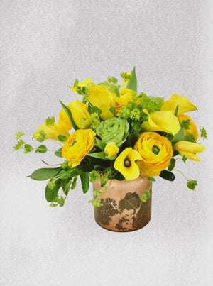 What a bright combination of lush flowers that will definitely brighten everyone’s day! We’ll use only the freshest and brightest roses, calla lilies and ranunculus in a unique and complimentary vase, accented with greenery detailing for a warm and airy feeling.