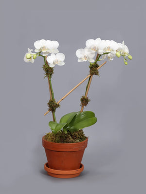 A timeless NYC classic gift that everyone loves. We have paired two mini orchid plants together in a traditional clay pot and braced the plants with bamboo sticks in an artistic and secured design. Sleek and simple and enjoyed by all!