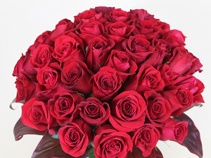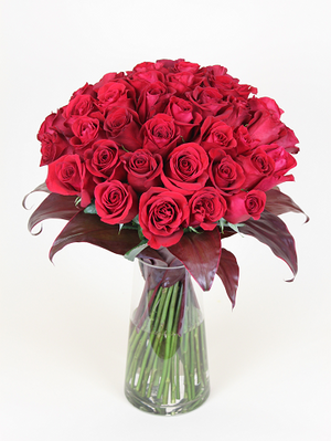 An updated version of a modern design. This arrangement of red roses is available in a full selection of quantities and features long stem red roses, complementary greenery and a sleek, clear glass vase.
