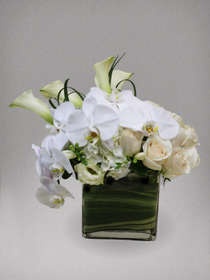 This monochromatic arrangement includes a focal point of beautiful orchids resting delicately on a pillow of roses and hydrangea, paired with the modern lines of calla lilies. This glass vase arrangement is a great size for any space.