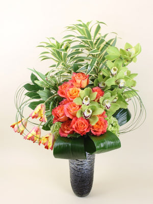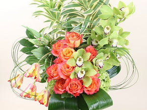 This dramatic display of vibrantly colored flowers has a strong, tropical feeling that will delight everyone. This tall and impressive arrangement includes an explosion of fresh orchids, roses and tulips with a lush mixture of complimentary greenery in a tall glass vase.