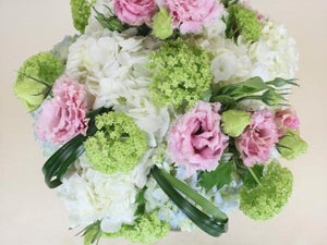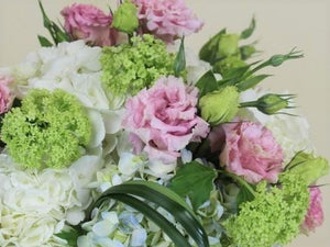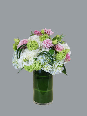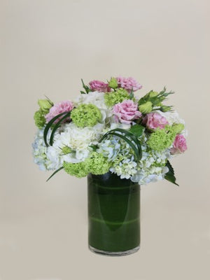For a twist on a traditional classic, we've paired beautiful hydrangeas with lisianthus, and viburnum in a sleek glass cylinder.  For a more modern edge, we've wrapped a leaf inside the vase and added loops of greenery for a finishing detail.  This medium height table arrangement will make a great statement piece.