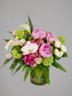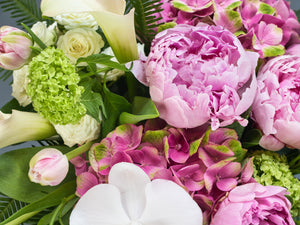 This vase arrangement features lush white hydrangea, peonies, viburnum and ranunculus, combined with other premium seasonal coordinating accents to make a soft display that every Mom will love.