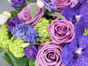 This lush arrangement includes an array of tones in deep purple and vibrant green. The flowers include hydrangea, roses, lisianthus, hyacinth, viburnum and orchids all placed inside a clear glass vase.