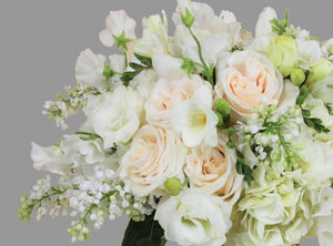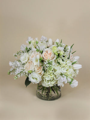 This premium mix of flowers is available in soft tones of white and ivory and is beautifully arranged in a clear glass vase and includes a lush collection of roses, hydrangea, tulips. lisianthus, freesia, sweet pea and lilac. This arrangement has a light, sweet smelling fragrance that will delight everyone who passes by.