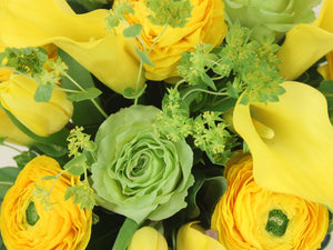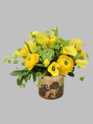 What a bright combination of lush flowers that will definitely brighten everyone’s day! We’ll use only the freshest and brightest roses, calla lilies and ranunculus in a unique and complimentary vase, accented with greenery detailing for a warm and airy feeling.