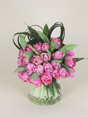 For the special person who loves tulips, this is just perfect! A gorgeous bouquet of fresh Dutch, double tulips are paired with the clean lines of complementary greenery and dropped inside a sleek, clear glass vase. This makes a great gift or centerpiece for your home.