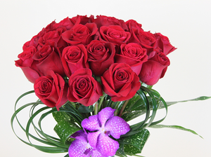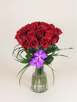 Long stem red roses are wrapped up with a bow of lily grass, all ready to gift to your special Valentine! Beautiful red roses are arranged with complementary greenery in a clear glass vase and accented with two vibrant orchid heads. Designed using two complementary color combinations for a clean overall look. This will certainly get you bonus points with your loved one for going the extra distance this Valentine's Day!