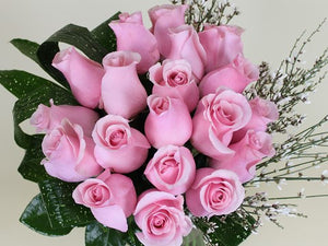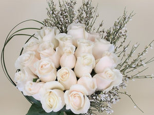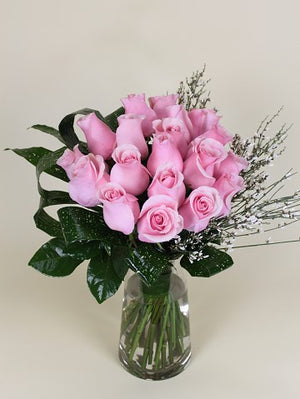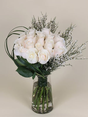 For a more traditional arrangement, we've paired long stem roses with ginestra and coordinating greenery inside a simple clear glass vase - the result is a modern take on a classic composition with clean lines and delicate features. Available in various colors and quantities.
